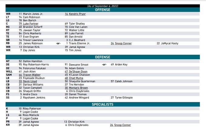 Jun 12 2022 901 PM EDT. The defense of the Jacksonville Jaguars is in a fantastic spot in Week 6 versus the Indianapolis Colts. Jaguars Week 1 depth chart has arrived. Betting Odds Prediction Depth Chart.